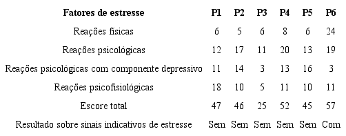 Dados obtidos por meio da ESI (Tabela 2) indicaram que apenas P6 apresentava sinais significativos de estresse. Entre as demais participantes, o item reações físicas apresentou os menores escores se comparado ao item reações psicológicas. Os escores do item reações físicas para P1, P2, P4 e P5 foram menores que os escores dos itens reações psicológicas, reações psicológicas com componente depressivo e reações psicofisiológicas.