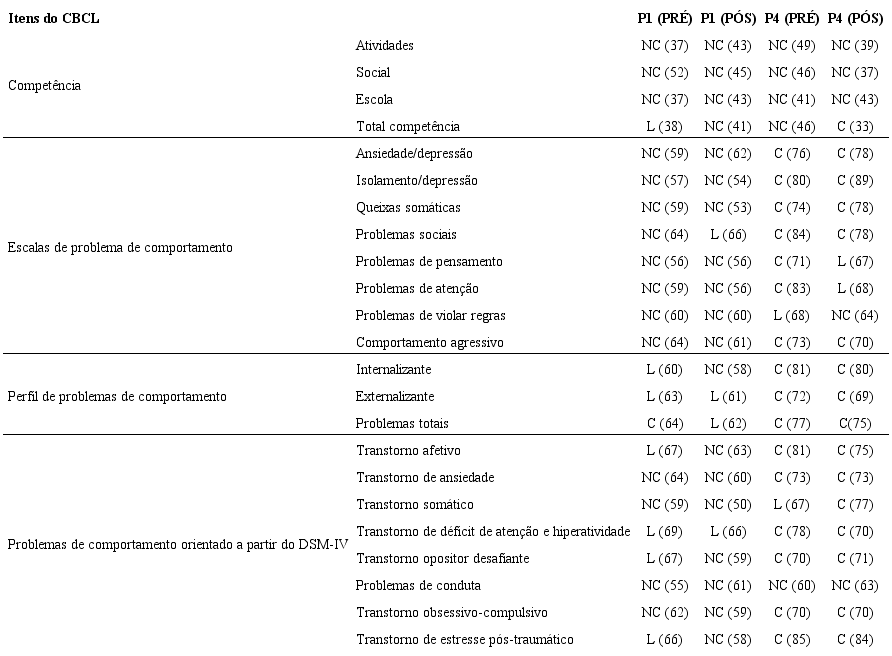 Para P1, o escore de competência total, que envolve problemas de comportamentos na interação com os pares (isto é, dificuldade de relacionamento interpessoal, solidão, dependência dos adultos, rejeição de outras crianças, alvo gozações), passou de limítrofe para não clínico, com redução dos problemas de comportamento relacionados às competências social e acadêmica. Para P4, entretanto, houve uma alteração do escore de competência social de não clínico para clínico, com decréscimo do escore de competência social.