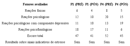 Em relação à ESI, ambas as participantes continuaram a não apresentar sinais significativos de estresse após a intervenção, porém o escore total e dos fatores avaliados (reações físicas, reações psicológicas, reações psicológicas com componente depressivo e reações psicofisiológicas) diminuiu.