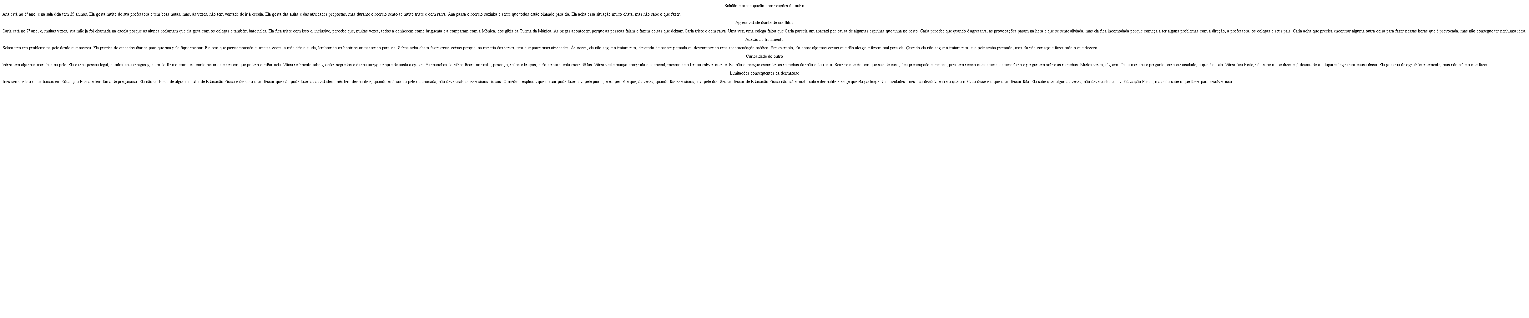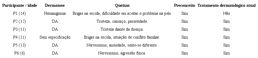 A partir da entrevista inicial realizada com as mães, foram coletadas informações sobre a doença de pele, queixas apresentadas, preconceito e tratamento. Esses dados estão descritos no quadro 3. Com exceção de uma participante, todas realizavam tratamento dermatológico. Por meio dos relatos das mães, foram constatadas as seguintes queixas de problemas de comportamento: sentimentos de ansiedade e tristeza, dificuldade em aceitar a doença, problemas no relacionamento interpessoal caracterizado por brigas, agressividade e dificuldade em defender-se e contestar o outro. Além disso, todas as mães afirmaram que as filhas sofriam preconceito devido à doença de pele.