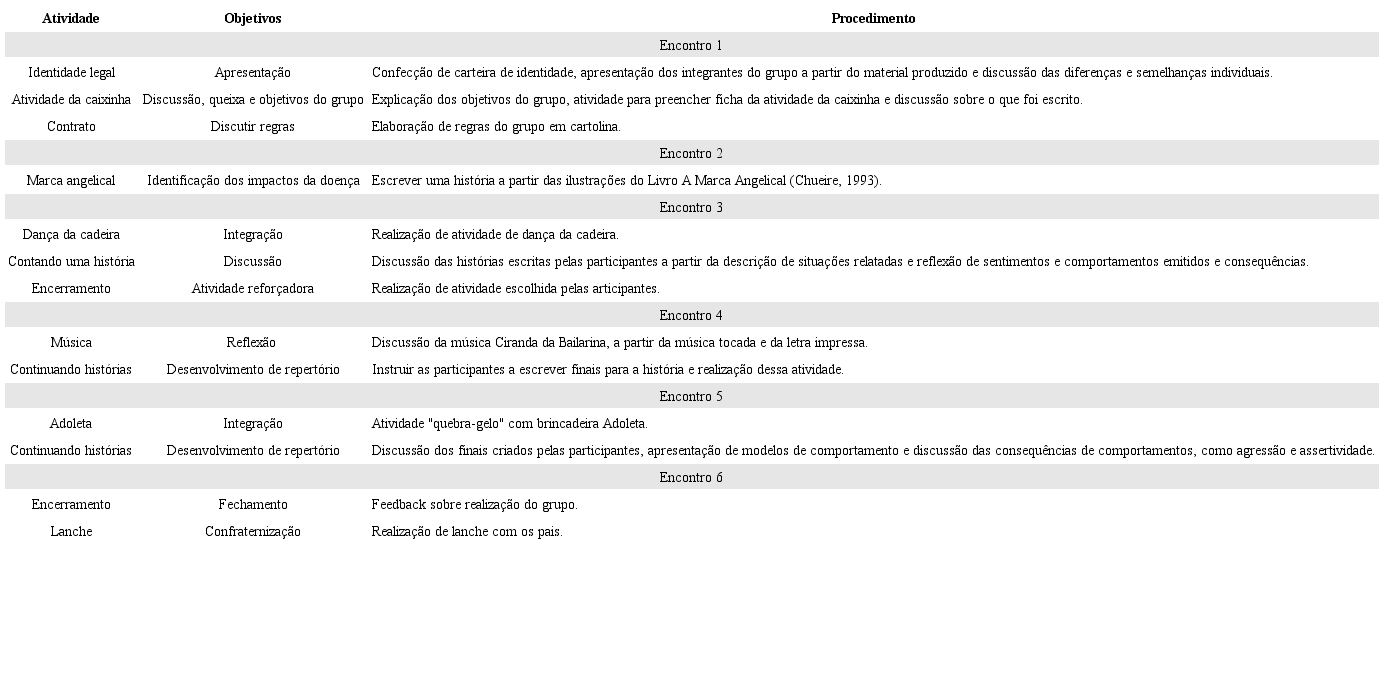Os dados coletados na avaliação comportamental e a queixa descrita pelas participantes foram os critérios utilizados para definição do tema abordado nas sessões de intervenção. A estruturação do programa de intervenção pautou-se, sobretudo, no tema de relacionamento interpessoal, ao abordar aspectos sobre resolução de problemas, limitações da doença, preconceito, estigmatização e bullying.