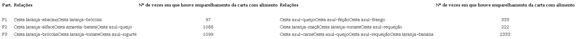 Fase de intervenção/jogo. Nessa fase, o P1 obteve oito vitórias e um empate em 12 partidas; o P2 e o P3 obtiveram duas vitórias e dois empates, respectivamente em 11 e 13 partidas. Durante as partidas, o dado foi lançado 46 vezes. O número de partidas variou devido às faltas dos participantes à creche. A Tabela 2 apresenta os emparelhamentos entre cartas e alimentos mais frequentes para cada participante.