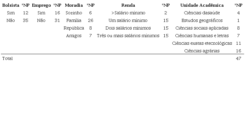 A amostra foi composta majoritariamente por sujeitos pertencentes a aérea de Ciências Agrárias (n=16, 34%); com faixa etária entre 20 a 23 anos (n=30, 63,8%). Quanto à residência, a maior parte (n=26, 55,3%) morava com os familiares e uma parcela possuía emprego remunerado (n=16, 34%) ou era beneficiária das bolsas concedidas pela universidade (n=12, 25,5%), sendo estas, auxílios alimentação, moradia e pesquisa, conforme disposto na tabela 1.