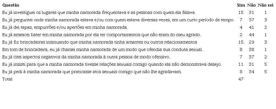 Notou-se maior prevalência da violência psicológica, visto que 46,8% (n=22) dos sujeitos assinalaram já ter investigado ou questionado reiteradamente a namorada acerca dos lugares que ela frequentava e 4,3% (n=2) ameaçaram cometer agressão ffsica contra a parceira. Estes dados corroboram com os achados de Minayo et al. (2011) ao verificarem que 85,3% dos jovens apontaram a violência psicológica como a forma de agressão mais vivenciada nos relacionamentos sexuais-afetivos. Diferentemente, Cecchetto, Oliveira, Njaine, e Minayo (2016), em estudo feito em dez cidades brasileiras, com adolescentes do sexo masculino, apontaram a agressão ffsica como a principal forma de violência cometida em relacionamentos sexuais-afetivos. Entretanto, os abusos psicológicos foram evidenciados por esses jovens como recurso que o homem poderia dispor para garantir sua autoridade e supremacia, causando impactos tão ou mais nocivos que a violência ffsica.