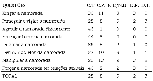 As condutas agressivas mais identificadas entre aqueles que assinalaram “Concordo Totalmente” foram, respectivamente, a ameaça de agressão (violência psicológica, n=44, 93,6%); forçar a relação sexual (violência sexual, n=40, 85,1%); difamação (violência moral, n=39, 83%), destruição de objetos (violência patrimonial, n=32, 68,1%); xingamento (violência psicológica, n=30, 63,8%); perseguição (violência psicológica, n=28, 59,6%) e manipulação (violência psicológica, n=20, 42,6%), conforme tabela 3. Já Guerreiro et al. (2015), em estudo com jovens, observou que a violência ffsica foi evidenciada, perante todas as outras formas.