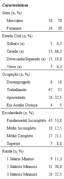 Verificou-se que majoritariamente a amostra era composta por pessoas do sexo masculino (70%), com idade média de 62,50 (±9.09), casados (66,3%), ativos do ponto de vista laboral (52%), com escolaridade fundamental incompleta (53,8%) e renda média de 2 salários mínimos (38,8%).