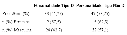 Procurando-se investigar a prevalência da Personalidade tipo D em uma amostra de pacientes internados por complicações cardiovasculares, o presente estudo demostrou uma prevalência de 41,25% de pacientes cardíacos com esse tipo de personalidade, dados esses que corroboram com as pesquisas mais recentes que trazem prevalências entre 23,5% e 46,5% em pacientes com síndrome metabólica, DM, aterosclerose, pós-revascularização do miocárdio e com DCV instalada (Demirci, Yıldız, Selvi, & Akpınar, 2016; Milicevic, Jaksic, Aukst-Margetic, & Jakovljevic, 2015; Ogińska-Bulik, 2014; Sumin et al., 2012; 2015; Sumin & Raih, 2016; Tziallas et al., 2011).
