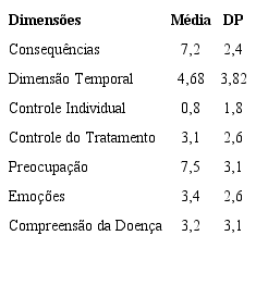 No presente estudo, como se pode observar, as médias mais elevadas obtidas no questionário de percepção de doença foram relativas à representação emocional da doença na dimensão preocupação (7,5 ± 3,1) e na representação cognitiva em relação às consequências da doença (7,2 ± 2,4), a menor média foi encontrada em relação ao controle individual da doença (0,8 ± 1,8).