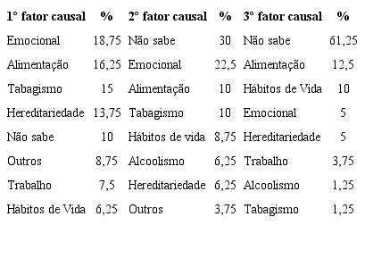 Conforme os dados acima, verificou-se alta prevalência dos fatores atribuídos às questões emocionais como causadoras da doença, assim como altas taxas de desconhecimento dos fatores causais, observando-se também taxas moderadas atribuídas à má alimentação, tabagismo, hereditariedade e hábitos de vida não saudáveis.