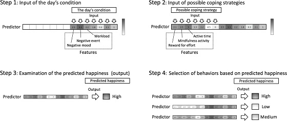 Our results showed 82.6% overall accuracy of identifying middle and high happiness using the combination of lifelog data. This suggests that our approach can predict the behaviors that increase individuals' happiness in their daily lives. A concrete application example of our approach is shown in Figure 3. By entering features representing the condition of the day (e.g., negative mood, negative event, workload, etc.; step 1) and features representing an activity that can be performed in the day (e.g., reward for effort, mindfulness activities, active time, etc.; step 2) into the constructed predictor, the predicted happiness corresponding to the input value is outputted (step 3). Because the output of happiness differs according to the input value of the coping strategies (step 4), by referring to such output results, it is possible to use the output as useful information for selecting coping strategies for enhancing happiness.