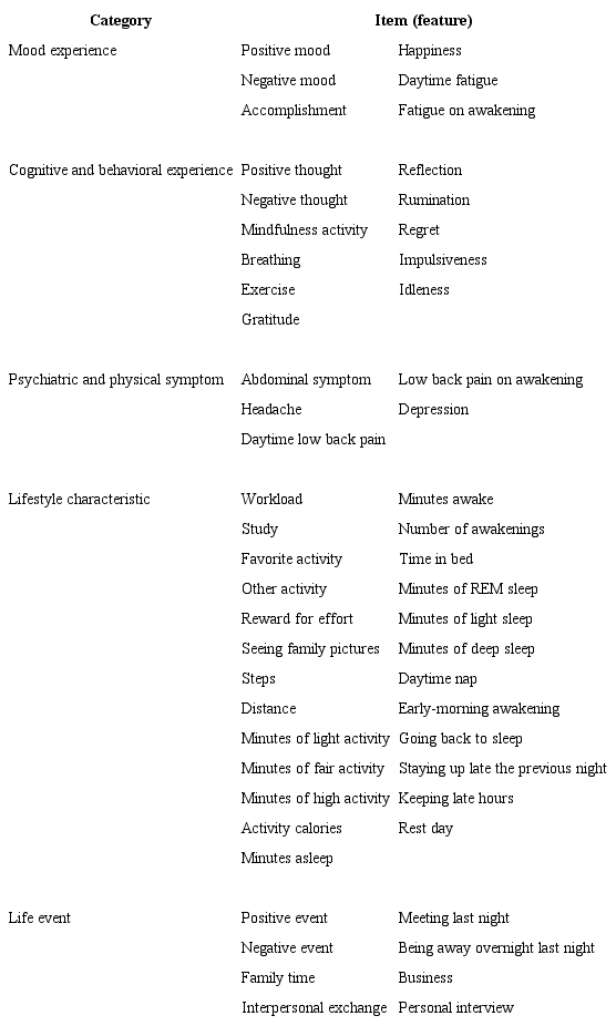 We asked a participant (a man in his 20s with no physical and mental issues) to record the lifelog items below in his daily life for about eight months using two iPhone apps, Count Log Lite and MoodTools, and one smartwatch, the Fitbit Alta HR (Fitbit, Inc.), which allowed easy recording. We selected 55 features (variables) comprising: a) mood experiences (positive and negative mood, accomplishment, fatigue etc.); b) cognitive and behavioral experiences (positive and negative interpretation, rumination, gratitude etc.); c) psychiatric and physical symptoms (depression, headache, abdominal symptoms etc.); d) lifestyle characteristics (amount of sleep, physical activity, relaxation etc.); and e) life events (positive and negative). For the assessment of happiness, we asked the participant to rate the degree of happiness on that day, ranging from not at all (0) to extremely (10), and categorized the happiness score into three classes: low, middle, or high happiness. We have depicted all features in Table 1.