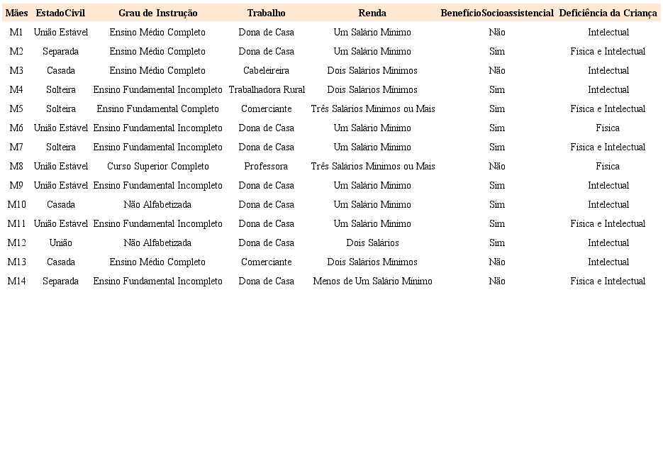 Na tabela 1, são apresentados os dados sociodemográficos das entrevistadas da pesquisa. Nesse sentido, com intuito de conhecer melhor o perfil e a realidade das participantes da pesquisa, algumas perguntas foram realizadas, como estado civil, grau de instrução, profissão, renda familiar, se possui benefício socioassistencial e o tipo de deficiência física ou intelectual do filho/a.