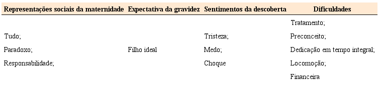 Esses mesmos resultados foram apresentados no estudo de Rodrigues, Rodrigues, Silva, Jorge, e Vasconcelos (2009), abordando que a representação de maternidade para algumas mães é repleta de diversos sentimentos contraditórios, pois, ao mesmo tempo que consideram algo bom, não deixam de destacar as dificuldades da maternidade e as mudanças nos vários aspectos de vida, fato esse que se torna mais evidente no caso de mães de filhos/as com deficiência.