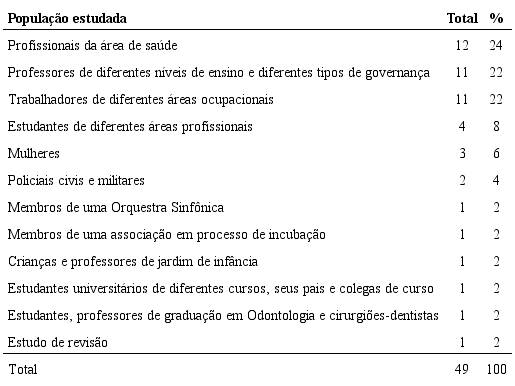 No que diz respeito à população investigada, como é possível observar na tabela 1, foi constatado que os estudos envolveram principalmente profissionais da área de saúde (n = 12), entre os quais estão médicos, enfermeiros e psicólogos atuantes em clínica e na saúde pública e professores de diferentes níveis de ensino (n = 11) de escolas particulares e públicas. Amostras envolvendo trabalhadores de diferentes áreas ocupacionais, como servidores públicos de nível técnico que atuam em áreas de atendimento ao público, vendedores, trabalhadores da área da Justiça, da área administrativa, entre outros, totalizaram 11 estudos. Estudantes de diferentes áreas profissionais, estudos focados em mulheres, policiais civis e militares, membros de uma orquestra sinfônica, membros de uma associação em processo de incubação e estudos que envolviam mais de um tipo de população (crianças e professores; estudantes, seus pais e colegas; estudantes, professores e profissionais) também foram identificados, mas com menor frequência.
