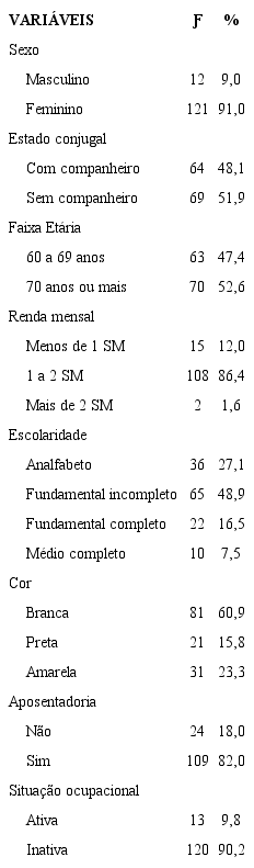 Nota-se (Tabela 1) a prevalência de idosos do sexo feminino (91,0%), que não possuem companheiro (51,9%), com mais de 70 anos (52,6%), renda mensal de um a dois SM (86,4%), da cor branca (60,9%), aposentados (82,0%) e com situação ocupacional inativa (90,2%). Observou-se também que a maioria dos idosos possui Ensino Fundamental incompleto (48,9%) e não estuda atualmente (97,0%).