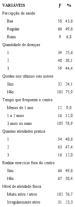 O perfil sociodemográfico e de saúde dos idosos foi avaliado por meio de um questionário semiestruturado elaborado pelos próprios autores, composto por questões referentes à faixa etária (60 a 69 anos; 70 anos ou mais); sexo (masculino; feminino); estado conjugal (com companheiro; sem companheiro); cor (branca; preta; amarela); situação ocupacional (ativa; inativa); renda mensal em salário mínimo (SM) de referência no Censo Demográfico 2017 do Instituto Brasileiro de Geografia e Estatística (IBGE) (menos de 1SM; 1 a 2 SM; mais de 2 SM); aposentadoria (sim ou não); escolaridade (analfabeto; Fundamental incompleto; Fundamental completo, Médio incompleto); percepção de saúde (boa, regular, ruim); quedas nos últimos seis meses (sim; não); tempo que frequenta o centro (menos de 1 ano; 1 a 2 anos; 3 anos ou mais); quantas atividades pratica no centro (1; 2; 3); realização de exercício fora do centro (sim; não).