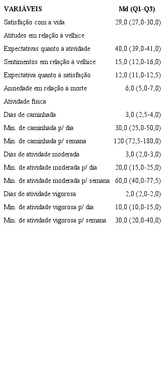 Conforme os achados da Tabela 3, os idosos apresentaram as seguintes medianas nas variáveis psicológicas: satisfação com a vida Md = 29,0; expectativas quanto à atividade Md = 40,0; sentimentos em relação à velhice Md = 15,0; expectativa quanto à satisfação Md = 12,0; e ansiedade em relação à morte Md = 6,0.