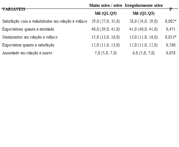 Houve diferença significativa (Tabela 4) entre os grupos apenas nos sentimentos em relação à velhice (p = 0,013) e na satisfação com a vida (p = 0,002). Tais achados indicam que os idosos ativos fisicamente são mais satisfeitos com a vida e possuem mais sentimentos de apreensão quanto ao futuro em relação à velhice do que os idosos irregularmente ativos.