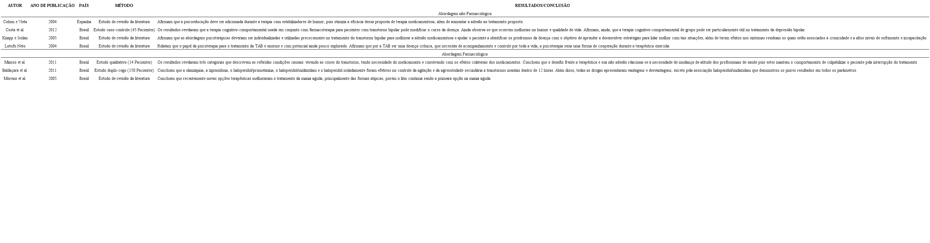 A partir dos textos estudados, foram identificados dois grandes grupos de abordagem terapêutica: Abordagem Farmacológica, três artigos (43%) e Abordagem não Farmacológica, quatro (57%). As conclusões dos artigos selecionados foram sumarizados na Tabela 1. Do grupo que trata da abordagem farmacológica para o tratamento do TAB, convém destacar artigos que demonstram o tratamento na fase aguda (mania e hipomania) e a fase de terapia. Já para o grupo da abordagem não farmacológica, há exemplos de artigos que demonstram técnicas e abordagens psicoterápicas para diminuição dos sintomas, sendo sugerida como complemento a abordagem farmacológica, e, em alguns momentos, como uma ferramenta importante na melhora da adesão ao tratamento.
