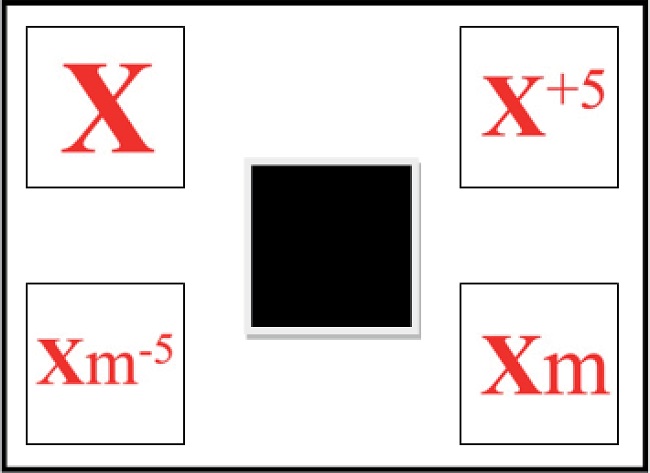 Os estímulos de comparação foram desenhos esquemáticos que representavam a cifragem usual dada a esses acordes. Mais especificamente, utilizou-se o X para representar a cifragem de um acorde maior (e.g., C), utilizou-se também o Xm para representar a cifragem de um acorde menor (e.g., Cm), o X+5 foi utilizado para representar a cifragem de um acorde maior com 5a aumentada (e.g., C+5) e, por último, o Xm-5 foi utilizado para representar a cifragem de um acorde menor com 5a diminuta (e.g., Cm-5). Sendo assim, em uma tentativa cujo modelo foi o som do acorde de Dó maior, o participante deveria escolher o estímulo de comparação X. Feito isso, seu responder era reforçado pela apresentação de uma série de estrelas na tela do computador, simultaneamente à apresentação do som de aplausos. Se o participante selecionasse qualquer um dos outros três estímulos de comparação, a tela escurecia por 1,5 s. A Figura 1 apresenta um desenho esquemático de uma tentativa do treino.