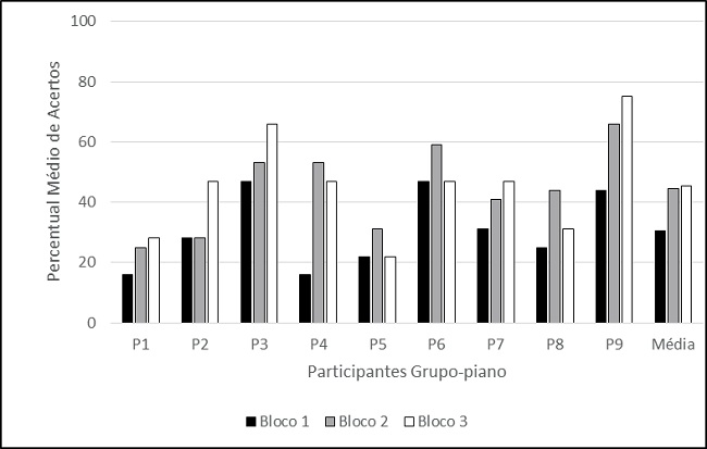 Os resultados dos participantes do Grupo-piano obtidos no Treino Discriminativo são apresentados na Figura 3. É possível observar que, de maneira geral, o percentual de acerto de cinco dos nove participantes aumentou em cada bloco na medida em que o treino ocorreu. O participante P5 foi o que apresentou os menores escores de acertos, a saber, 22%, 31% e 22% de acertos nos blocos 1, 2 e 3, respectivamente. O participante P9, por sua vez, foi aquele que obteve os maiores escores de acertos, 44%, 66% e 75%, também respectivamente. O percentual médio de acerto de todos os participantes desse grupo foi de 30,6% no bloco 1, 44,4% no bloco 2 e 45,5% no bloco 3.