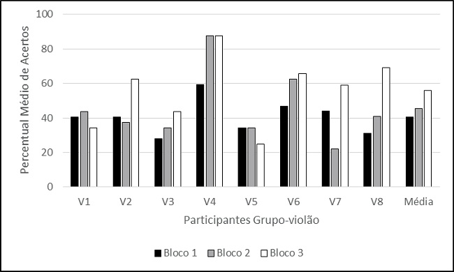 Os resultados dos participantes do Grupo-violão obtidos no Treino Discriminativo são apresentados na Figura 4. É possível observar que, de maneira semelhante ao que ocorreu com o Grupo-piano, para cinco dos oito participantes do Grupo-violão o percentual de acerto aumentou bloco após bloco. Apenas os participantes V1 e V5 obtiveram escores inferiores durante o terceiro bloco de treino, quando comparados ao primeiro e ao segundo blocos de treino. O participante V4 apresentou os maiores escores de acerto nessa etapa (59,4%, 87,5% e 87,5% nos blocos 1, 2 e 3, respectivamente), e o participante V5, por sua vez, apresentou os menores percentuais de acerto (34,4%, 34,4 e 25% nos blocos 1, 2 e 3, respectivamente). O percentual médio de acerto de todos os participantes desse grupo foi de 40,6% no bloco 1, 45,3% no bloco 2 e 55,8% no bloco 3.
