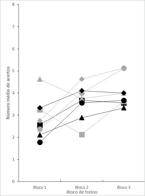 Não foram utilizados critérios de aprendizagem durante o Treino Discriminativo. Os participantes de ambos os grupos passariam pelos três blocos de treino independentemente dos escores de acerto obtidos, e sua participação era encerrada após o terceiro bloco, sem qualquer relação com o desempenho apresentado.
