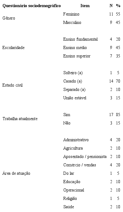 Em relação ao trabalho, estão atualmente desempenhando atividades profissionais 85% (n=17), verificou-se a prevalência de determinadas áreas de atuação, como a área administrativa 20%(n=4) e comércio/vendas 20% (n=4). As profissões da área administrativa envolvem empresários, bancários e funcionários públicos, principalmente, ao passo que a área comércio/vendas representa as profissões de comerciante e vendedores.
