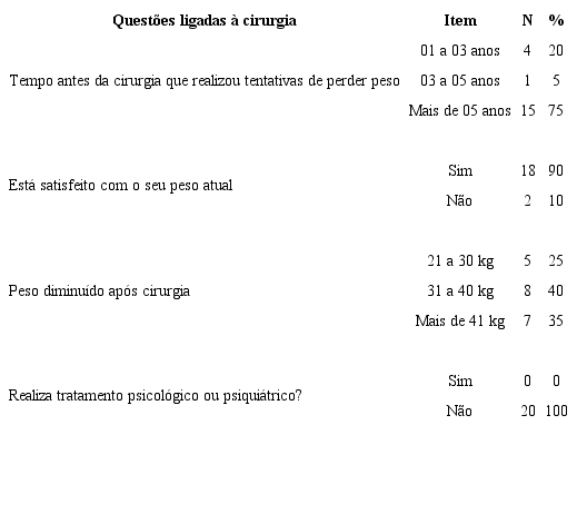 No que se refere às questões da cirurgia bariátrica, o tempo médio de realização desse procedimento nos pacientes avaliados foi de 17,55 meses (DP=4,96). A análise descritiva indicou que a maioria dos pacientes avaliados despendeu mais de 5 anos da vida em tentativas para perder peso antes da cirurgia 75% (n=15), de acordo com as informações indicadas na Tabela 2. Aproximadamente 40% (n=8) dos pacientes relataram terem perdido entre 31 e 40 kg no total, e, inclusive, grande parte dos pacientes demonstra-se satisfeita com o seu peso atual 90% (n=18). Um dado interessante é que nenhum paciente tem acompanhamento psicológico ou psiquiátrico atualmente, exceto as consultas periódicas com um psicológico oferecidas pela equipe multidisciplinar durante o período de um ano pós-cirurgia.