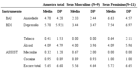 As análises dos instrumentos que avaliam sintomas de ansiedade (BAI), depressão (BDI) e uso de substâncias podem ser visualizadas na Tabela 3. Referente aos escores do BAI observou-se que 80% (n=16) dos pacientes avaliados indicavam a presença de sintomas mínimos de ansiedade, 15% (n=3) pontuavam sintomas leves e 5% (n=1) sintomas moderados. Nenhum dos pacientes avaliados demonstrou a presença de sintomas graves de ansiedade. O escore médio total observado no BAI foi de 5,70 (DP=5,921), indicando a presença de sintomas com intensidade mínima de ansiedade.