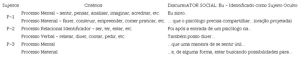 A análise dos dados privilegiou e se baseou nos discursos individuais obtidos através do questionário escrito. Os resultados foram extraídos do corpus que encapsulou as respostas às questões esboçadas no ins-trumento desenhado para a coleta de dados. Então, a análise de cada uma delas forneceu uma amostra da configuração dos modos como cada sujeito significa e representa sua percepção sobre o trabalho do psicólogo nessas instituições.