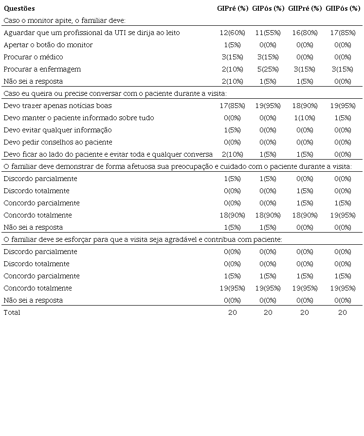 A Tabela 4 condensa os conhecimentos dos participantes sobre a rotina de visita à UTI antes e depois da reunião com equipe de Psicologia sobre auxílio da equipe e formas de contato com o paciente. Na quinta questão acerca do que fazer caso o monitor apitasse, 60% dos participantes Grupo I antes da intervenção responderam que aguardariam ajuda da equipe, e 55% acertariam a conduta após intervenção. No Grupo II, a percentagem de acertos foi próxima antes e depois da intervenção (80 e 85% respectivamente). A sexta questão investigava a possibilidade de conversar com paciente: 95% dos participantes de ambos os grupos acertaram a conduta, declarando que apenas notícias positivas deveriam ser tema de contato entre a visita e o paciente na UTI.