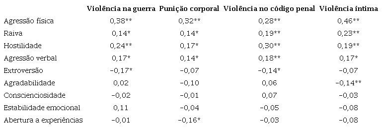 A fim de verificar a estrutura fatorial da EVAFV formada pelos fatores, prosseguiu-se com a validade convergente e discriminante, com o questionário de agressão de Buss-Perry e o inventário dos cinco fatores da personalidade.