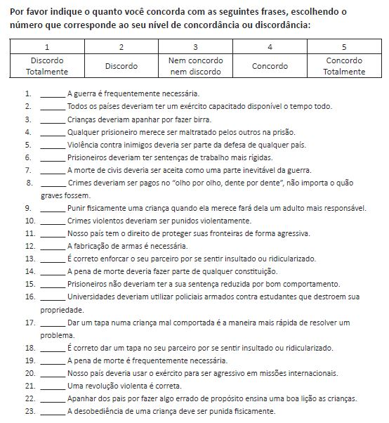 Escala Velicer de Atitudes frente à Violência (EVAFV), validada para o contexto dos EUA por Anderson et al. (2006), composta por 39 itens distribuídos em quatro fatores: violência do Código Penal (por exemplo: "Prisioneiros não deveriam ter a sua sentença reduzida por bom comportamento"); violência na guerra (por exemplo: "Qualquer nação deve estar pronta com um exército forte em todos os momentos"); punição corporal em crianças (por exemplo: " Punir uma criança fisicamente quando ela merece fará dela um adulto responsável e maduro"); violência íntima (por exemplo: "Está tudo bem para um parceiro sufocar o outro se for insultado ou ridicularizado). A escala mede o nível de atitudes em uma escala Likert, variando de 1 = discordo plenamente até 5 = concordo plenamente. Conforme ficha a seguir: