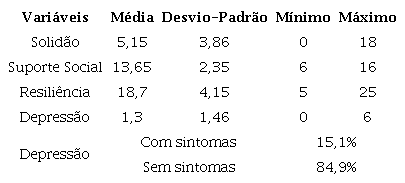 Os descritivos dos indicadores de saúde mental encontram-se na Tabela 3. Foi constatado que 15,1% da amostra apresentou triagem positiva para depressão. As médias indicam que, no geral, a amostra apresentou índices mais altos para suporte social e resiliência, e baixos índices de solidão e depressão.
