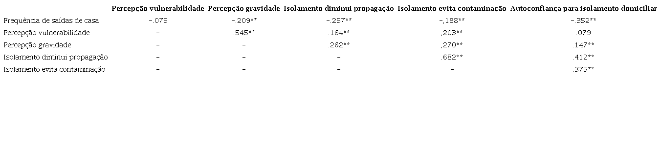 A Tabela 4 exibe as relações entre as crenças e atitudes sobre o coronavírus/isolamento domiciliar. Foram encontradas relações significativas de magnitudes fracas e moderadas entre quase todos os construtos. A frequência das saídas de casa não apresentou associação significativa com percepção de vulnerabilidade à covid-19 e autoconfiança para realizar isolamento domiciliar.