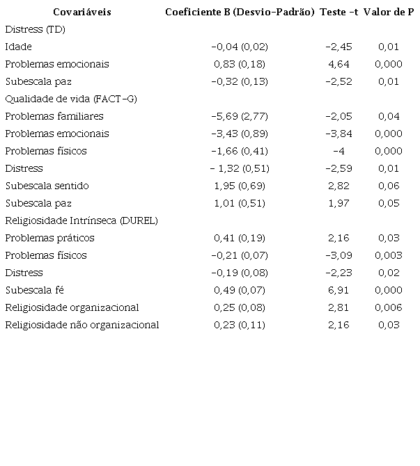 A modelagem linear identificou os principais preditores dos instrumentos de medida: o distress (TD) se mostrou um importante preditor da qualidade de vida (FACT-G). Já a qualidade de vida (FACT-G) foi preditora de Bem-Estar Espiritual (FACT-SP), e o Bem-Estar Espiritual (FACT-SP), da qualidade de vida global (FACT-G), tal como descrito na Tabela 3. Na regressão linear, os fatores idade (jovem), presença de problemas emocionais e menor pontuação na subescala paz (FACT-Sp) foram preditores de um maior escore de distress. Melhor qualidade de vida esteve associada à ausência de problemas familiares, emocionais e físicos, a baixo distress e a um maior escore nas subescalas Sentido e Paz (FACT-Sp). Outrossim, a presença de problemas práticos, maior pontuação na subescala Fé, na RO e na RNO, baixo distress e ausência de sintomas físicos estiveram associados a um maior uso da RI (Tabela 4).