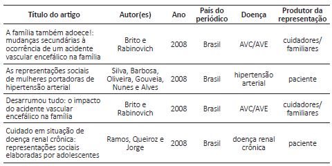 Dos 18 artigos encontrados, 16 são de periódicos brasileiros, e 2 de periódicos internacionais, especificamente colombianos. Em relação à doença objeto do estudo, obteve-se: câncer (7), hipertensão arterial (3), acidente vascular cerebral/acidente vascular encefálico (AVC/AVE) (3), doença renal crônica (2), Alzheimer (1), diabetes (1) e fibromialgia (1). No que se refere ao sujeito produtor da representação social, verificou-se que 9 artigos abordavam a representação social dos familiares ou cuidadores, 8 se referiam à representação social do sujeito com a doença, e 1 tratou da representação social tanto do paciente quanto do familiar.