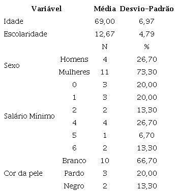 O delineamento desse recorte refere-se a um estudo do tipo quantitativo, transversal e descritivo, realizado em abril de 2019. Foram avaliados 15 idosos, sendo os critérios de inclusão: pertencer ao grupo Neurociências e Cognição em Idosos (NeuroCog-Idoso), pela Universidade Católica de Brasília; e os de exclusão: não ter participado de alguma variável analisada, ter desempenho inferior a dois desvios-padrão das medianas de Brucki, Nitrini, Caramelli, Bertolucci e Okamoto (2003) no Miniexame do Estado Mental (MEEM) para a faixa de escolaridade e/ou não ter dado continuidade ao estudo no período de dois anos.
