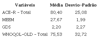 Em geral, a amostra foi composta por idosos com elevado desempenho cognitivo (ACE-R e MEEM), baixo número de sintomas depressivos (GDS) e médias elevadas em qualidade de vida (WHOQOL-OLD) (Tabela 2).