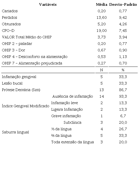Conforme a Tabela 3, um terço da amostra apresentou lesão bucal e infamação gengival, e 86,7% referiram usar próteses. A média de dentes perdidos foi de 13,60 (DP=±9,42), obturados, 5,20 (DP=±4,26), e a de CPO-D foi de 19 (DP=±7,45). Observa-se que grande parcela dos dentes perdidos pode ser produto de ações mutladoras, expressas pelas extrações dentárias. Adicionalmente, observou-se elevada prevalência de saburra lingual, o que indica dificuldades de higienização. No que se refere ao OHIP, dos domínios investgados, o domínio Dor foi o mais prevalente, seguido por desconforto na alimentação, alimentação prejudicada e paladar. O valor médio de OHIP foi de 3,73 (DP=+3,94).