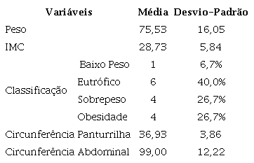 No que se refere aos parâmetros do estado nutricional, aproximadamente metade da amostra tinha sobrepeso e obesidade (53,4%), o que explica o alto IMC (M= 28,73 DP=±5,84) e medidas de circunferência, conforme a Tabela 4.
