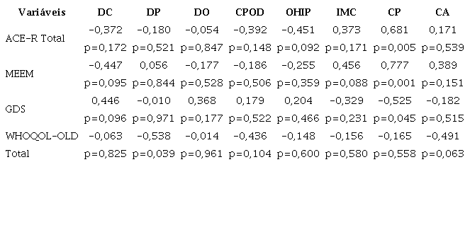 Foram observadas correlações estatsticamente significativas entre o desempenho cognitivo global no ACE-R e MEEM e a Circunferência de Panturrilha (quanto maior o desempenho, maior o valor da circunferência da panturrilha), número de sintomas depressivos na GDS e a Circunferência da Panturrilha (quanto mais sintomas depressivos, menor o valor da circunferência da panturrilha) e entre Total na WHOQOL-OLD e número de dentes perdidos (quanto mais dentes perdidos, menor a qualidade de vida) (Tabela 5).