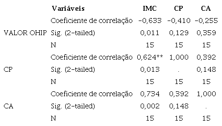 No que se refere a associações entre variáveis de saúde bucal e parâmetros de estado nutricional, houve correlações estatsticamente significativas entre IMC e Valor Total de OHIP (quanto maior o IMC, menor o Valor Total Médio de OHIP). Idosos com maior IMC também apresentaram valores maiores de Circunferência de Abdômen e Panturrilha (Tabela 6).