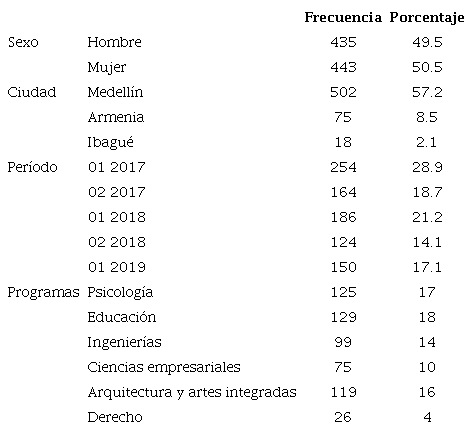 Estudio descriptivo-correlacional de corte transversal. El universo objeto de estudio fueron los estudiantes que ingresan a las universidades de Colombia. Participaron 878 estudiantes universitarios (49.5% hombres y 50.5% mujeres), en tres ciudades de Colombia: Medellín (57.2%), Armenia (8.5%) e Ibagué (2.1%), entre los períodos de inscripción a la universidad: enero del 2017 (28.9%), julio del 2017 (18.7%), enero del 2018 (21.2%), julio del 2018 (14.1%) y enero del 2019 (17.1%), en diferentes programas académicos (Tabla 1).