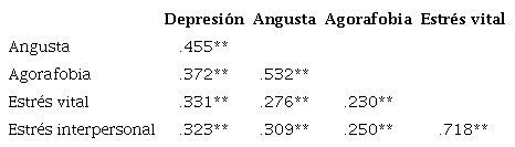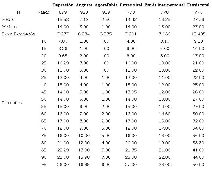 En relación con la prevalencia de síntomas y estresores, se consideró como punto de corte el percentl 75; puntuaciones superiores se establecieron significativas; para depresión: 20 o más; angusta: 11 o más; agorafobia: 4 o más; estrés vital 20 o más y estrés interpersonal 19 o más (Tabla 2).