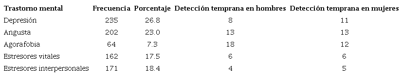 La prevalencia de los síntomas fue: depresión 26.8%, angusta 23%, agorafobia 7.3% y para los estresores la prevalencia fue de 17.5% para los estresores vitales y 18.4% para los estresores interpersonales.