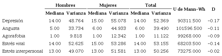 De acuerdo con los valores p, los datos analizados no siguieron una distribución normal de acuerdo con la prueba de normalidad Kolmogorov-Smirnov (K-S) (valor p=.000 para todas las escalas). Para la escala CES-D de depresión se obtuvo un valor de K-S ,094, curtosis 1.149, y asimetría .842. Para la escala de SCL-90 de angusta y agorafobia, los valores K-S .142 y .232 respectivamente, curtosis 2.719 y 6.751 respectivamente, y asimetría 1.485 y 2.344 respectivamente. Para la escala de estrés vital e interpersonal, los valores K-S fueron .058 y .073 respectivamente, curtosis .708 y .035 respectivamente y asimetría .316 y .202 respectivamente.