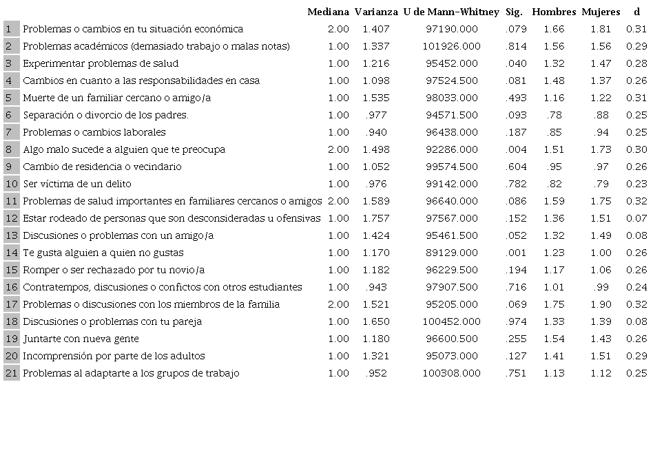 Se reportaron diferencias con relación al sexo en los siguientes estresores: estresor 3: “Experimentar problemas de salud” (puntuaciones mayores en las mujeres; U-MW = 95452,000, p=.040; d=.28; hombres X̅ = 1.32; mujeres X̅ = 1.47); estresor 8: “Algo malo sucede a alguien que te preocupa” (puntuaciones mayores en mujeres; U-MW = 92286,000, p=.04; d=.30; hombres X̅ = 1,51; mujeres X̅ = 1,73); estresor 14: “ Te gusta alguien a quien no gustas” puntuaciones mayores en hombres; U-MW = 89129,000, p=.001; d=.26; hombres X̅ = 1,23; mujeres X̅ = 1,00) (Tabla 5).