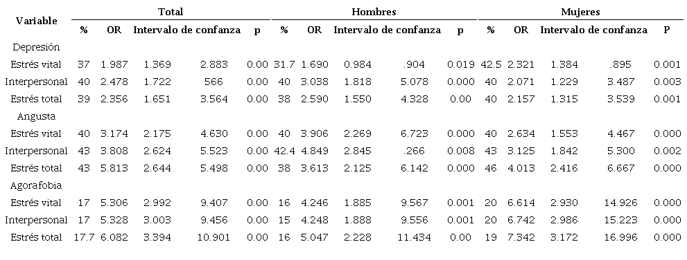 Resultados: A prevalência de sintomas de depressão, angústa e agorafobia foi de 26,8%, 23% e 7,3%, respectivamente. O estresse foi estabelecido como fator de risco para depressão (χ2 = 22,9; p = 0,00; OR = 2.356, intervalo de confança de 95%, 1.651 - 3.564), angústa (χ2 = 55.246; p = 0.00; OR = 5.813, 95% de intervalo de confança, 2.644 - 5.498) e agorafobia (χ2 = 55.246; p = 0.00; OR = 5.813, intervalo de confança de 95%, 2.644 - 5.498; homens: χ2 = 24.176; p = 0,00).